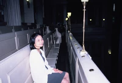 教会内の椅子に座るさくらこさん。後日、オルガン演奏会を聴いたと記憶しています。