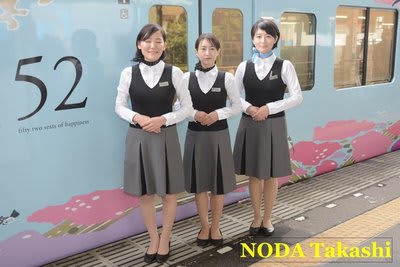 正面上の行先表示板のところには「52席の至福」を英訳した52 seats of happinessという表記がトランプの4つの記号をデザイン化したロゴとともに書かれていました。