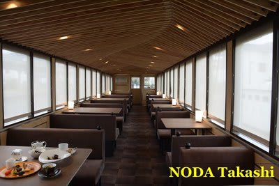 内覧会では、レストラン車両に注目しました。天井に木を多用しているのは、隈研吾さんらしいデザインです。